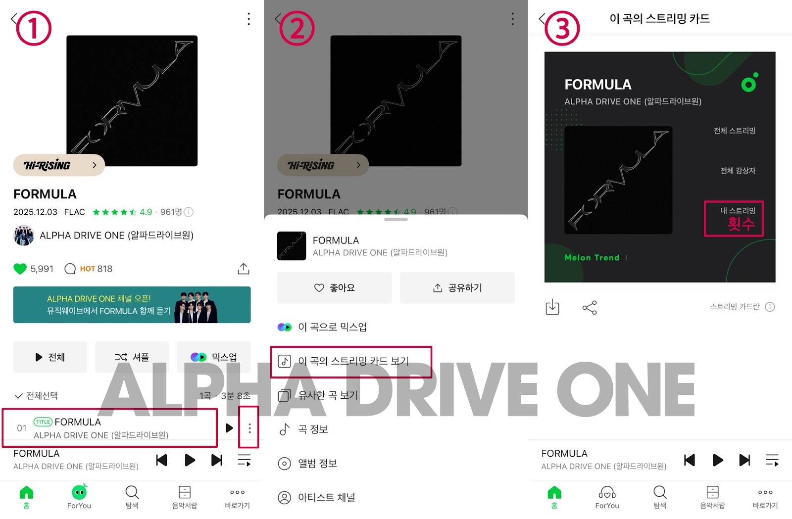 1) 스트리밍 모바일 인증: 멜론 - ‘FORMULA’ 곡 오른쪽 상단 점 3개 - 이 곡의 스트리밍 카드 보기