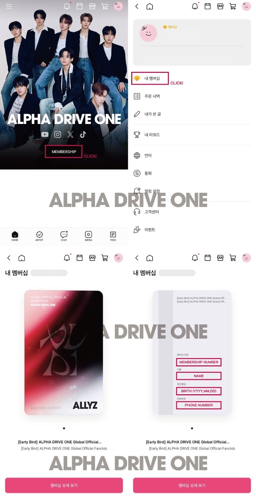 ALPHA DRIVE ONE Global Official Fanclub ‘ALLYZ’ 가입자 | 1. 본인 확인 가능 신분증 2. ALPHA DRIVE ONE Global Official Fanclub ‘ALLYZ’ 모바일 멤버십 카드 3. ALPHA DRIVE ONE THE 1ST MINI ALBUM [EUPHORIA] ‘FORMULA’ 음원 다운로드 내역서 + 회원 정보 확인 페이지 프린트물 4. ALPHA DRIVE ONE ‘FORMULA’ 멜론 스트리밍 350회 모바일 인증 & 본인 인증 정보 5. 멜론 또는 Spotify 내 ALPHA DRIVE ONE 아티스트 채널 팔로우 모바일 인증 * [음원 다운로드 내역서 + 회원 정보 확인 페이지]의 경우, 프린트물로만 인정됩니다. * [멜론 스트리밍 인증] 및 [멜론 또는 Spotify 아티스트 채널 팔로우 인증]은 모바일로만 가능합니다. |
