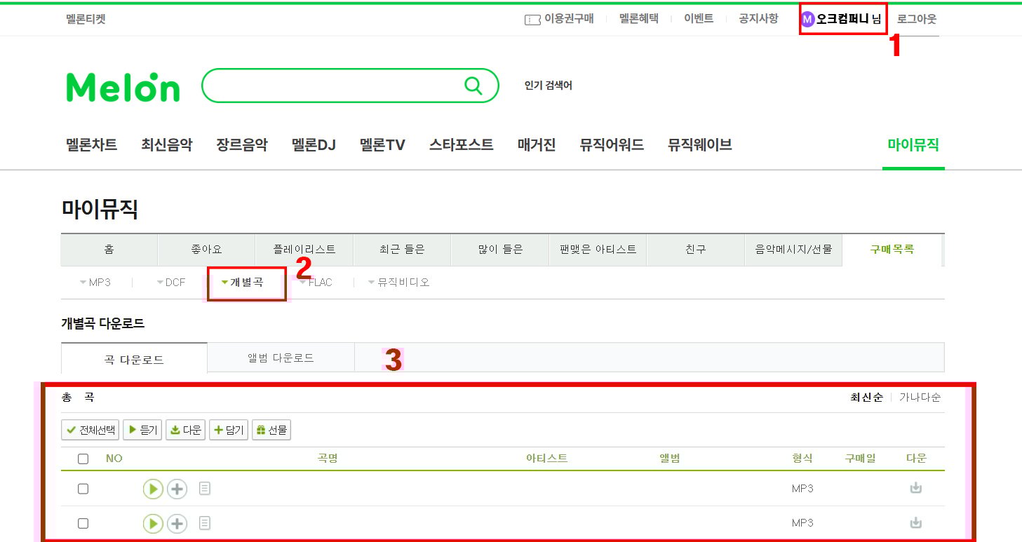 로그인 – 내 음악 – 구매한 음악