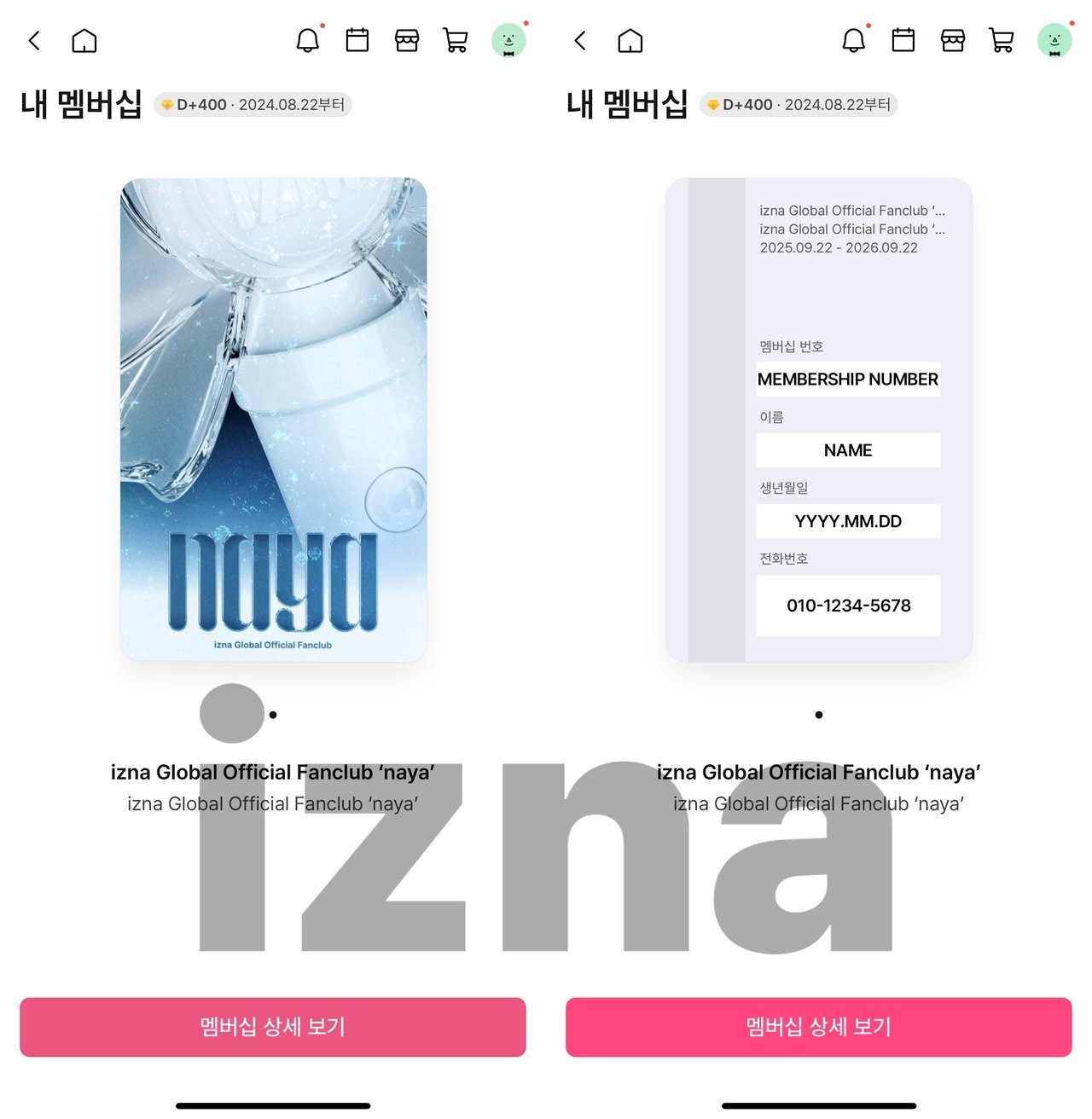 * izna 공식 팬클럽 'naya' 모바일 회원카드 화면 예시 이미지