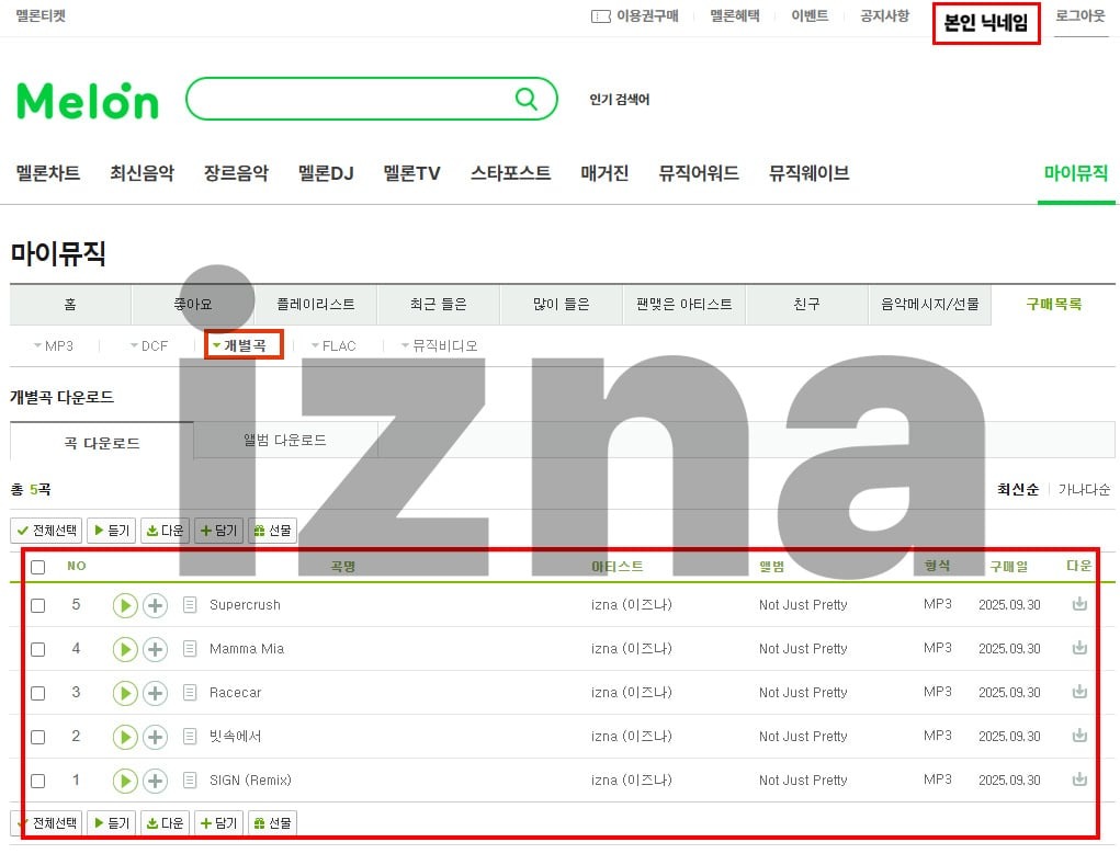 4. izna 2nd Mini Album 'Not Just Pretty' 전곡 음원 다운로드 구매 내역서 + 개인정보 관리 페이지