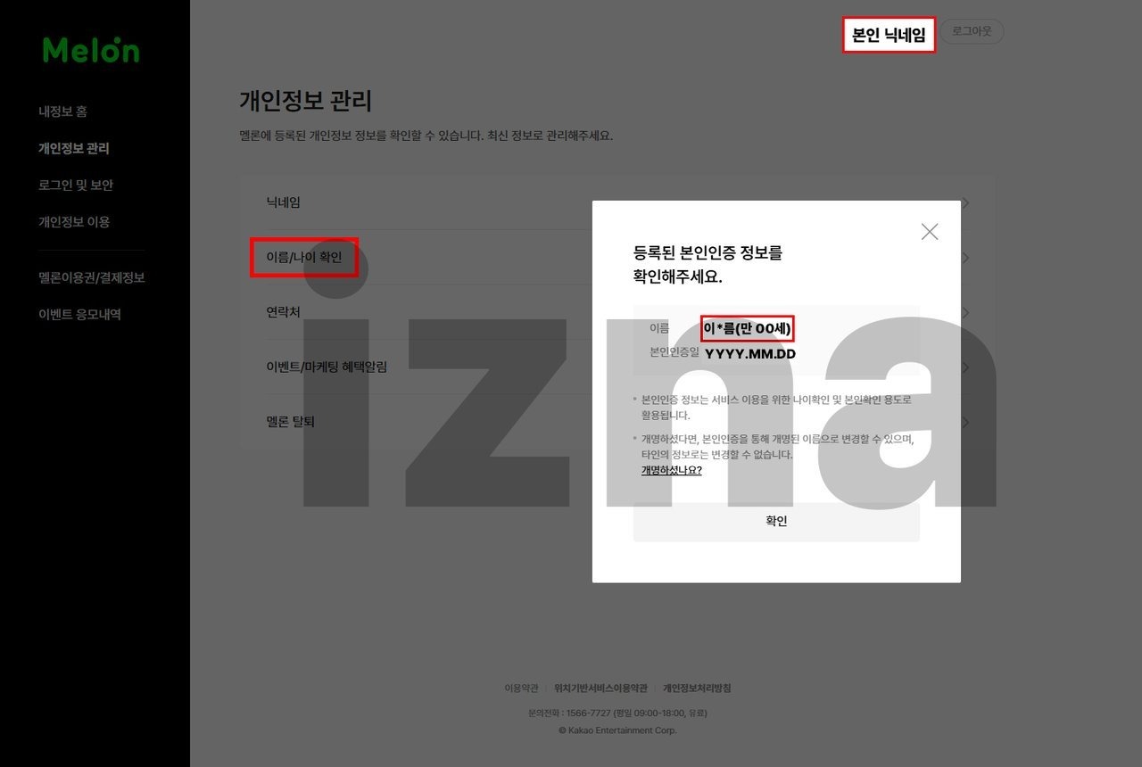 2) 개인정보 관리 페이지: 멜론 - 내 정보 - 개인정보 관리 - 이름/나이 확인