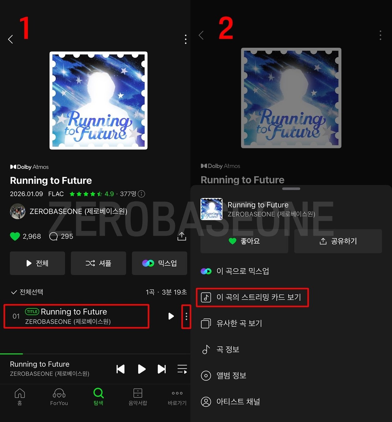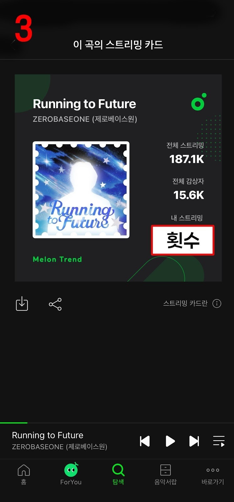 * 멜론 - ZEROBASEONE(제로베이스원) 검색 - ‘Running to Future’ 오른쪽 점 3개 - 곡 정보 - 아래로 스크롤 / 감상 횟수 확인