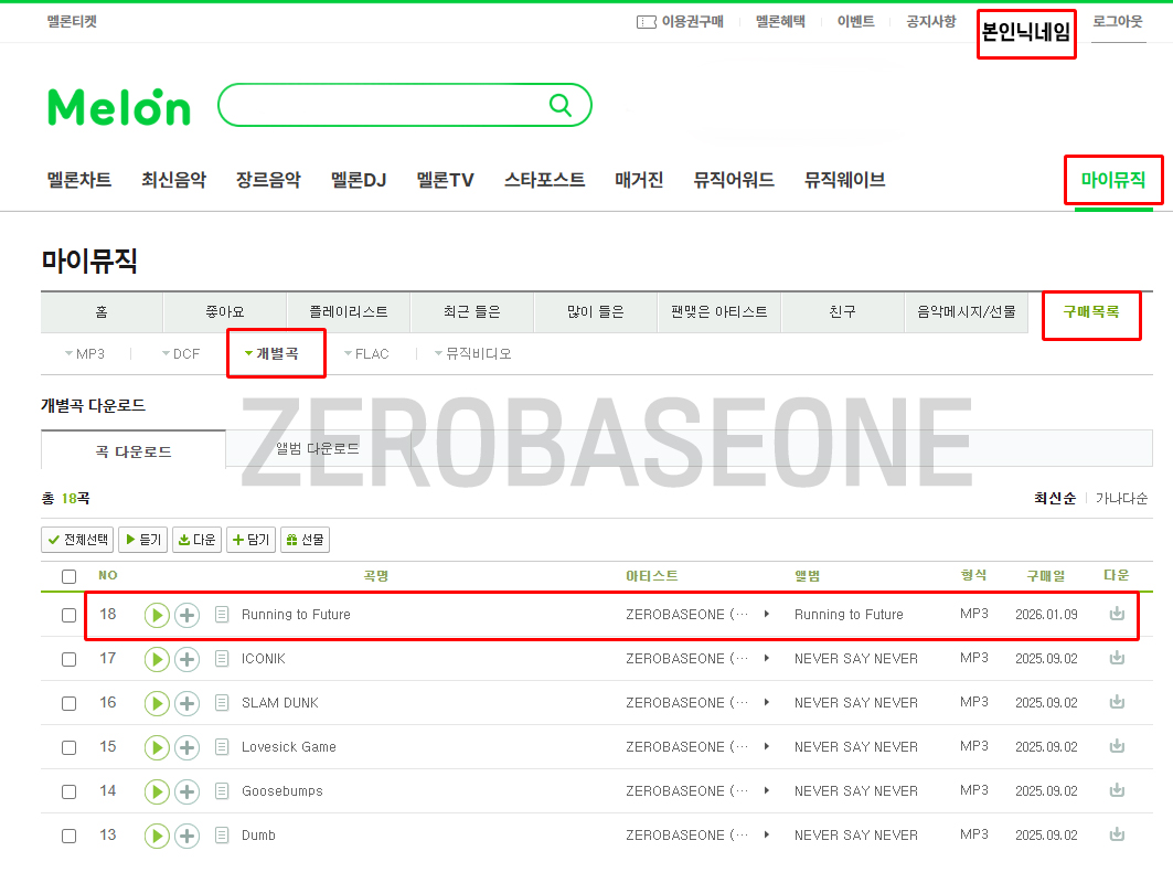 4. ZEROBASEONE ‘Running to Future’ 음원 다운로드 구매 내역서 + 회원 정보 확인 페이지