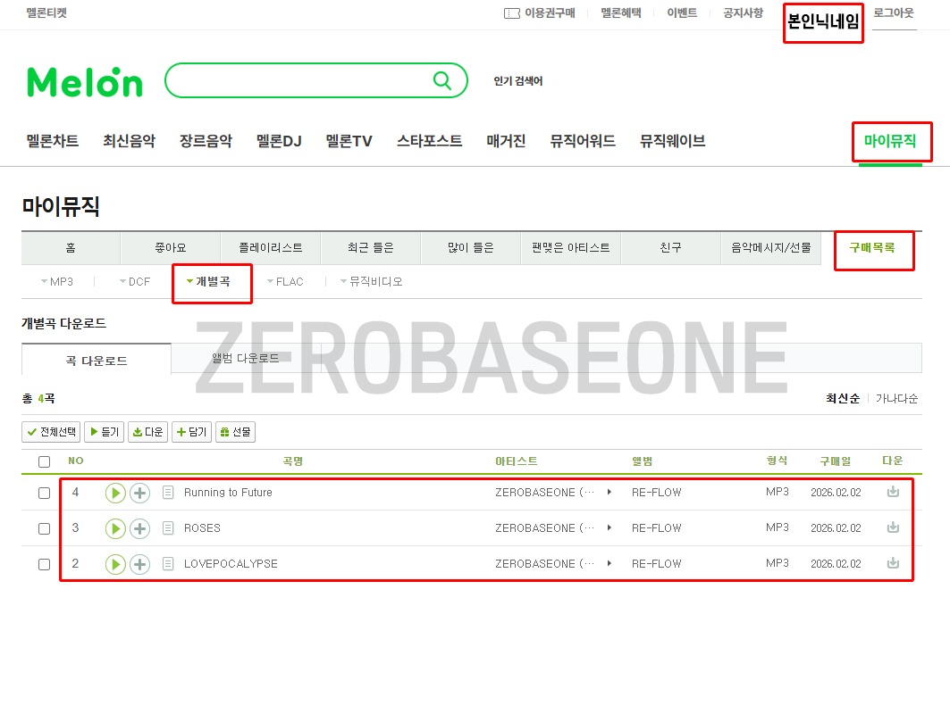 4. ZEROBASEONE Special Limited Album [𝐑𝐄-𝐅𝐋𝐎𝐖] 전곡 다운로드 구매 내역서 + 회원 정보 확인 페이지